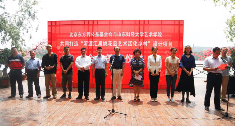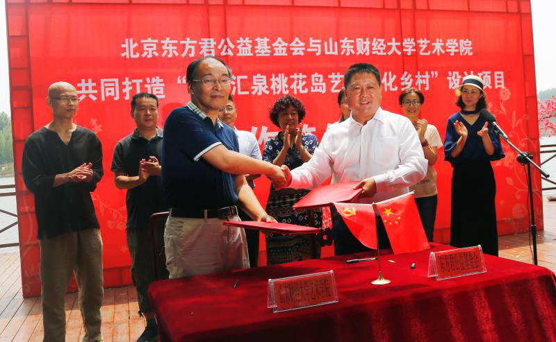 6月26日上午,北京东方君公益基金会与山东财经大学艺术学院共同打造“沂源汇泉桃花岛艺术活化乡村”设计项目合作签约仪式在淄博市沂源县龙子峪桃花岛举行。山东省政协常委、东方君公益基金会会长董方军、沂源县副县长张莹莹、学校校友会办公室主任耿金波、艺术学院院长范正红教授、学院党委书记杨春丽出席签约仪式。范正红和董方军代表双方签署了合作协议。艺术学院师生代表参加了此次活动。