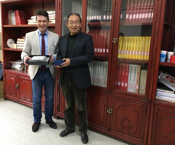 Paul Homles教授首先表达对上次见面时范院长赠送花瓶礼品的由衷喜爱并一直珍藏,范院长同样回忆了走访爱丁堡这座古老艺术之城及龙比亚大学所留下的深刻而美好的印象,并对对方周到安排深表感谢。在亲切友好的气氛中,双方将代表各自极高荣誉与礼节的精美礼品互予赠送。