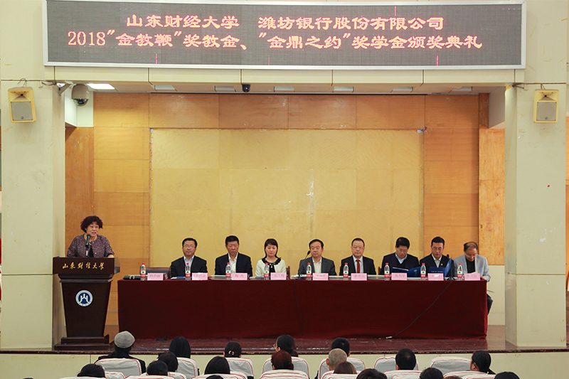 4月24日下午,第二届潍坊银行“金教鞭”奖教金、“金鼎之约”奖学金颁奖典礼在燕山校区举行。校党委书记王邵军,副校长张书学,潍坊银行股份有限公司党委书记、董事长郭虎英,文化金融事业部总经理高兰梅,学校党委宣传部、教务处、学生处和艺术学院负责人、师生代表参加了仪式。