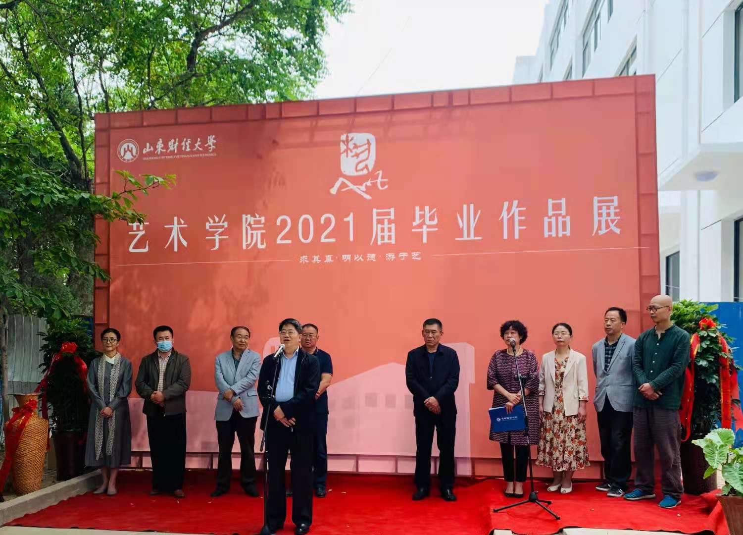 张书学副校长在致辞中代表学校向陈列馆的建设者和为筹备作品展付出辛勤劳动的艺术学院师生表示感谢。他谈到,2021年的毕业季是非常不平凡的,再过50余天,我们将迎来中国共产党100周年华诞,今年还是我国十四五规划的开局之年,又是两个一百年奋斗目标的交汇之年,国家的迅猛发展和日益强大,给青年人的事业成长提供了广阔舞台,希望生逢盛世的同学们倍加珍惜,不断砥砺奋进,谱写精彩的人生篇章。近年来,艺术学院坚持“艺术+财经”的特色发展模式,坚持“求其真、明以德、游于艺”的教育理念,不断提高教育教学质量,赢得了很高的社会声誉,招生分数和生源质量不断提升,实践证明,除了课堂上的理论传授之外,实景写生、作品拍卖、艺术调研、专业实习、作品展示、课程国际化等实践类课程对艺术类专业人才的培养是非常重要的。他指出,随着新建场馆的逐步投入使用,艺术学院的办学条件将大大改善,希望艺术学院科学统筹,充分发挥好新院址在教学、会展、陈列、实践、交流等多方面的功能,不断提高育人质量,为学校争创双一流财经特色名校做出积极贡献。