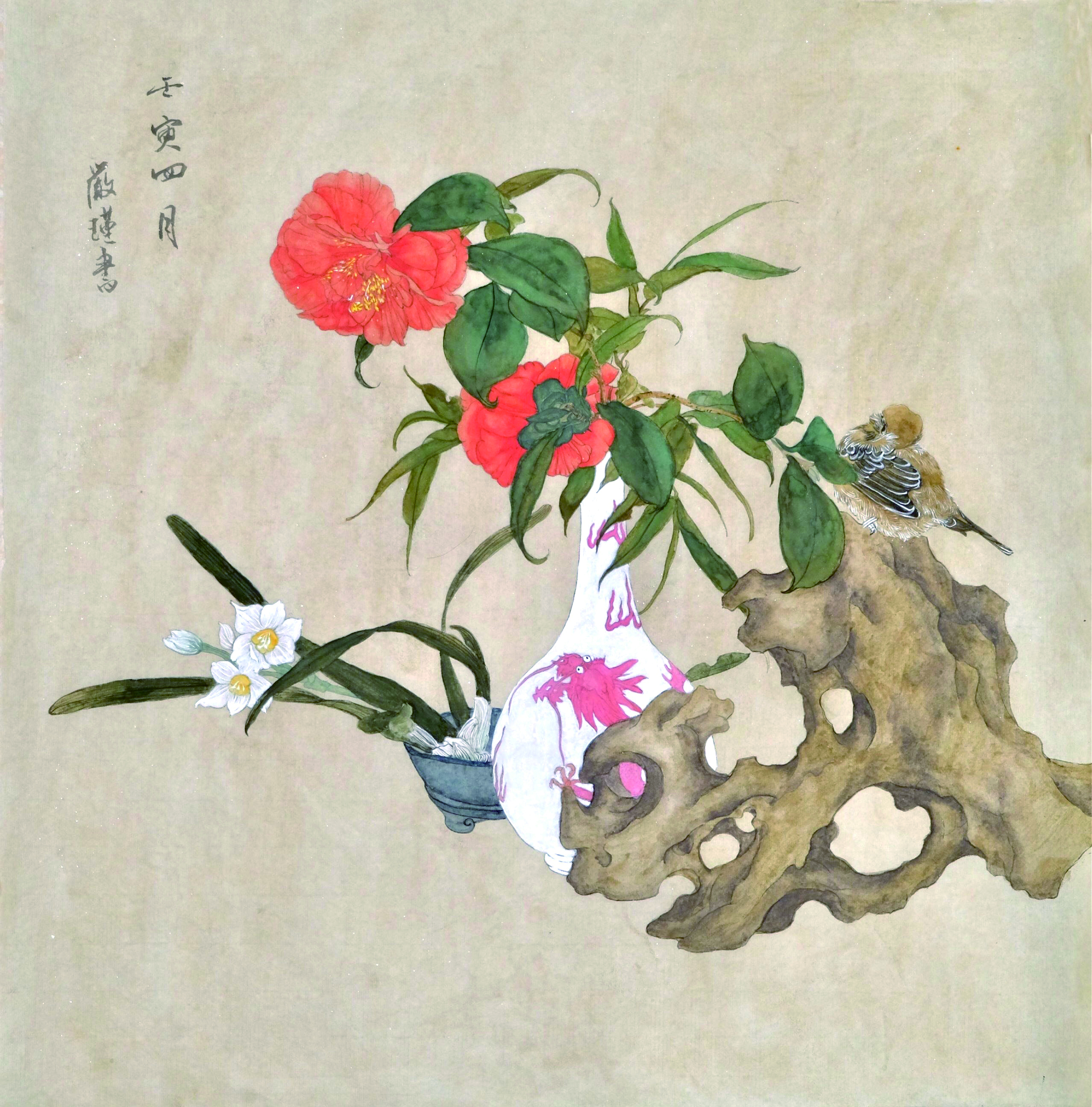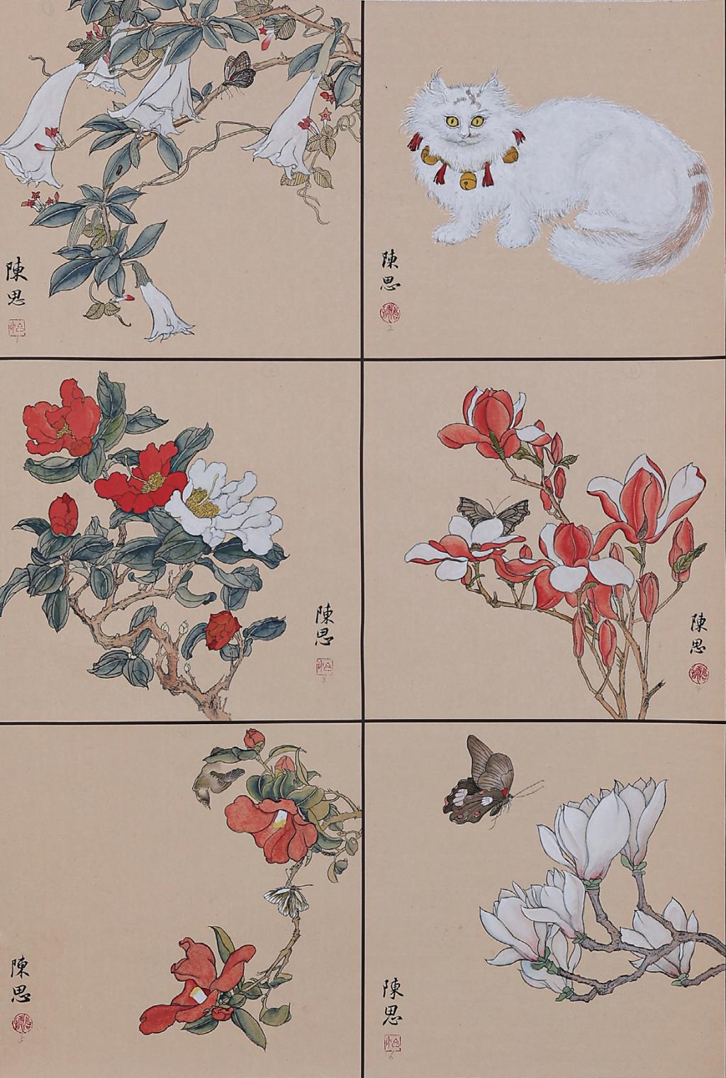 The whole 6 pieces of sketches are reassembled and created by referring to the typical images in Chen Hongshou's flower and bird album. There is no deliberate pursuit of neat effect. The overall work is rough and unrestrained, with scattered lines and exquisite colors. On the whole, it is eager to reflect the initial simple cognition of flower and bird painting, and hopes to achieve a rough but harmonious effect.