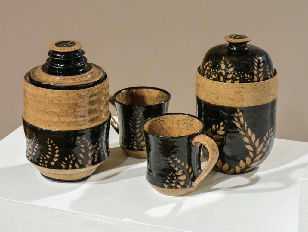 This set was made to show beautiful decoration on various clay body forms. The colors used in this sgraffito set are the terracotta clay body with black underglaze which was inspired by classic Greek Pottery (such as their red figure vases).