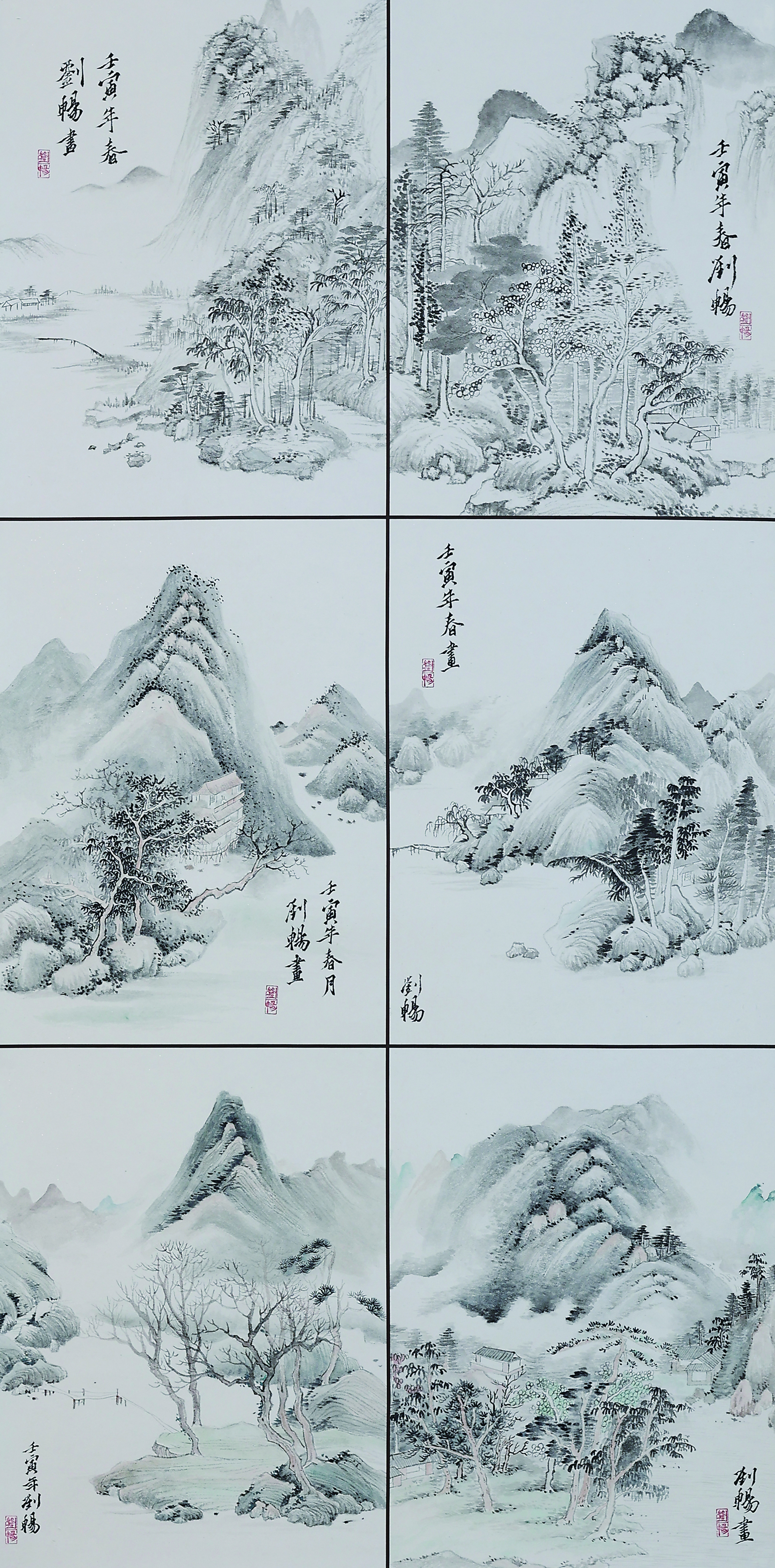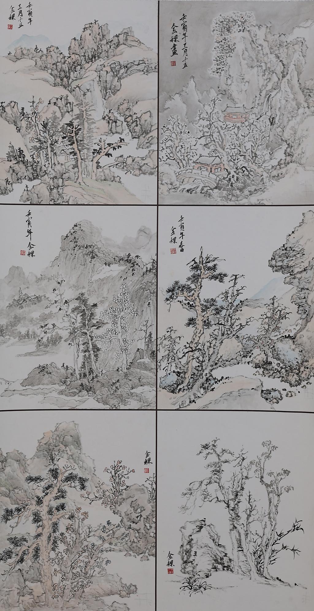 仿元人山水笔意,整幅为 6 块小品。作品采用传统披麻皴的笔法,间用水色,先皴后染,用墨色分山石结构、青色和浅绛丰富肌理,意在古朴稚拙中表现晕染变化之能势,在意境清幽中营造秀美灵动之神。