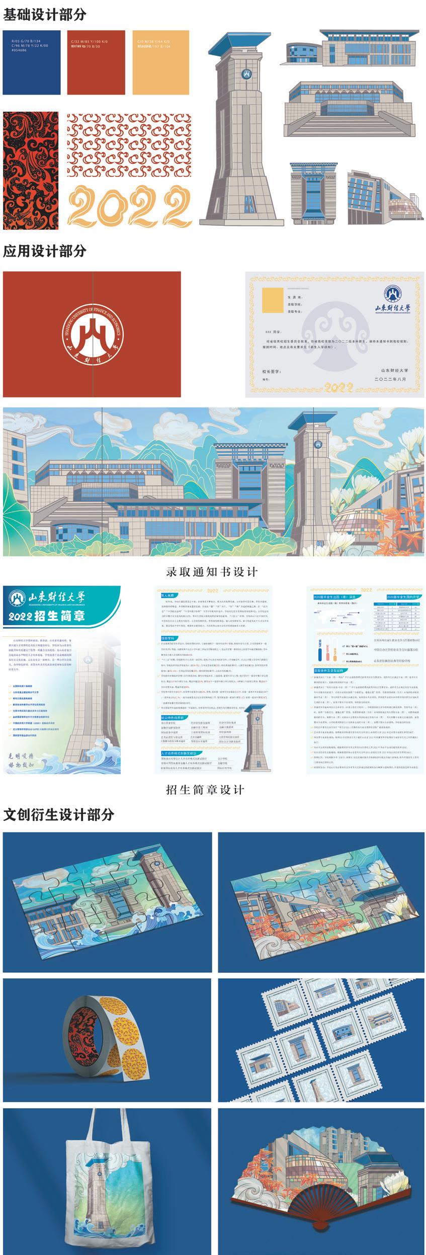 这是一系列为山东财经大学所设计的招生服务形象的设计作品,目的是通过对山东财经大学的招生服务视觉形象进行统一的视觉规划,来进一步唤起相关受众的更深层面的感召力,以及增强在校师生的向心力,并给予社会一个统一的视觉形象。设计作品中主要的设计元素为山东财经大学的校园标志性建筑,在基础设计部分的辅助图形的设计,灵感来自传统图案中的云气纹,同时也与山东财经大学校园 VI 系统中的“云天””沃土”形象形成统一的设计语言。在应用设计部分,主要为录取通知书的设计和招生简章的设计,设计形式是将校园建筑以及校园风景通过插画的形象来展现,并应用在其中,同时也进行了相应的文创衍生设计,目的是更好的服务于山东财经大学的招生工作。