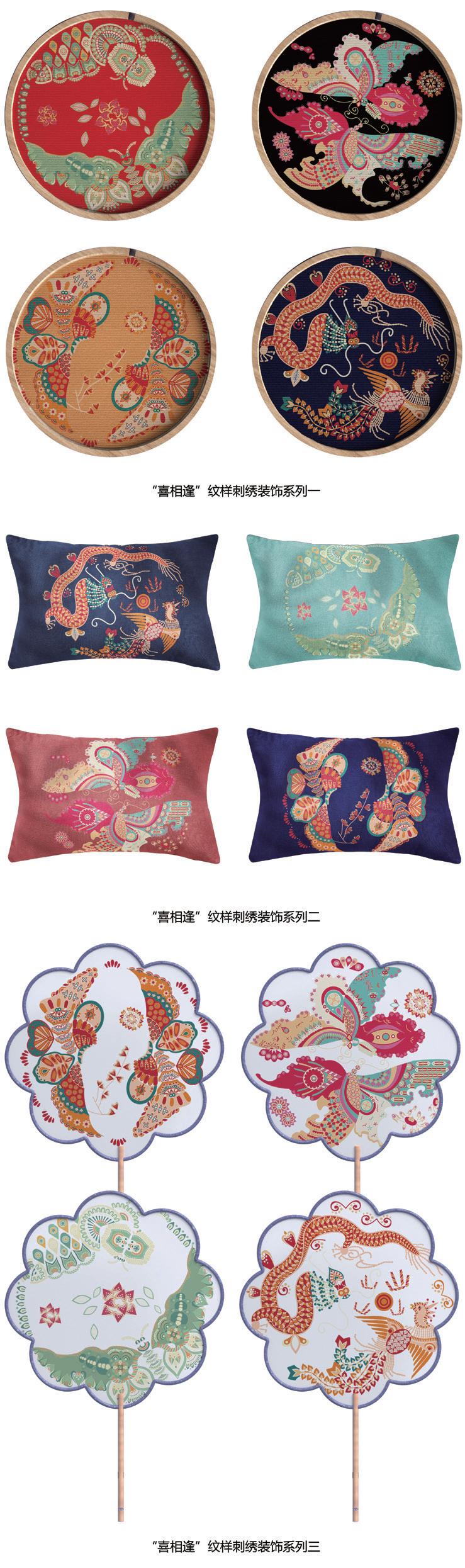 “喜相逢”纹样是中国传统视觉符号中一个重要的点,它沿着历史的线,将人们对“喜庆”之事的渴望和追求延续到现代。以明清时期“喜相逢”纹样为基础研究形态,从中提炼出具有代表性的图形文化元素,依据现代图形表现的法则和规律进行重新组合,进行现代设计研究,并用传统技艺刺绣将其展现出来。不仅实现传统文化的传承,还能促进现代设计行业的可持续发展。