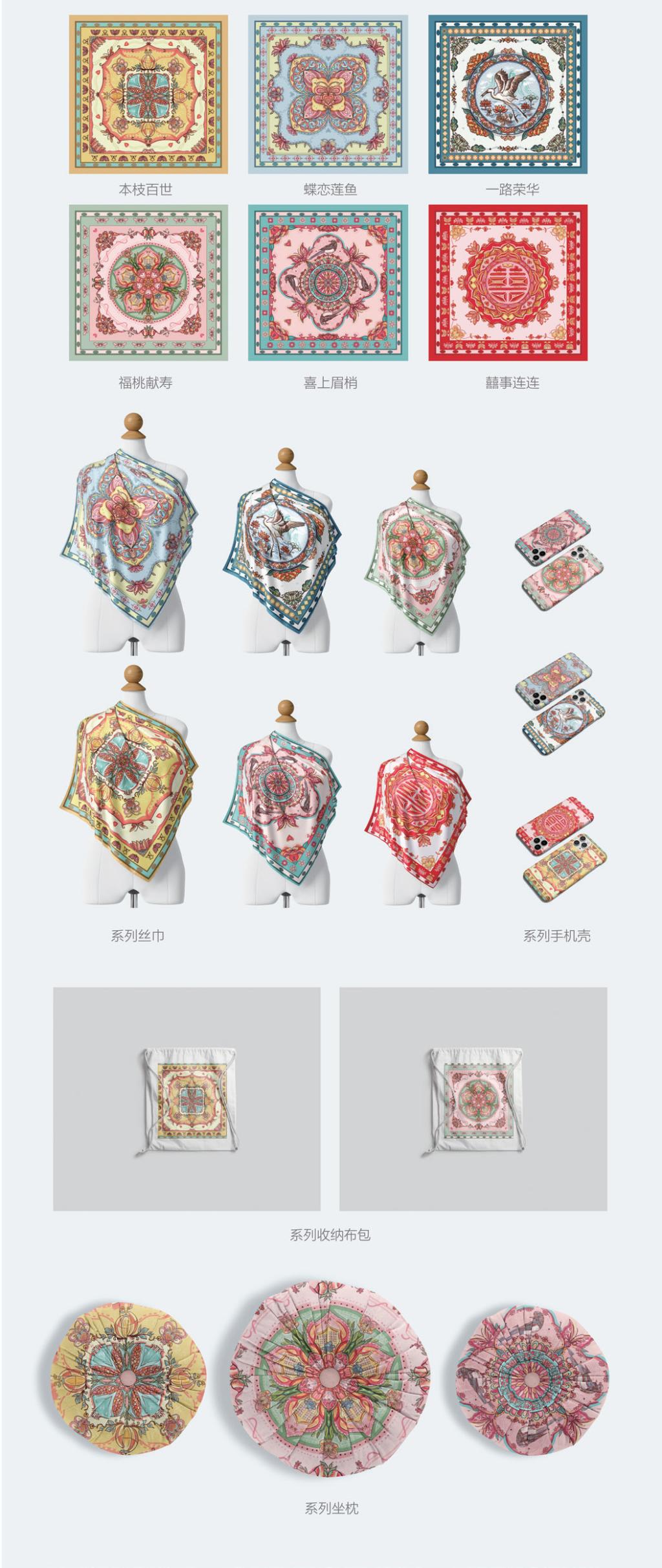 The design is mainly based on the Shandong color printed fabric design innovation as the starting point of exploration, analysis of the unique artistic characteristics of color printed fabric design, summarize the pattern features. He pattern design is mainly created by extracting and summarizing auspicious elements from the color printed fabric. The implied meanings of the six basic drawings respectively represent the good wishes of realizing ideal, family prosperity, longevity and health, auspicious wealth, god-given marriage and good luck. The implication of the pattern in the color printed fabric gives the new connotation of The Times on the applied cultural and creative products.
