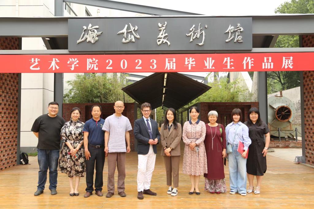 座谈开始前,学院领导陪同客人参观了海岱美术馆,Paul Holmes对学校将原锅炉房变废为宝的改建工程大为赞赏,对正在展览的2023届本科生毕业作品给予了高度评价。Paul Holmes对中国传统书画表现出了浓厚兴趣并频频提问,对双方在未来进行师生作品交流展提出合作建议。