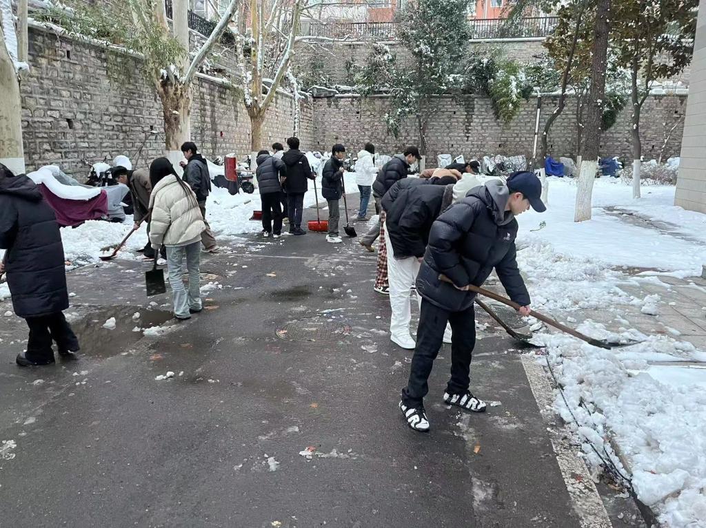 春寒料峭,积雪成冰。早上8点,志愿者们手持雪铲、刮冰刀等工具,迅速投入清扫工作。大家分工协作,有的奋力铲除主干道坚冰,有的细心清理台阶暗冰,有的转运积雪至绿化带……经过奋战,学院主要通道、美术馆前广场及停车场等区域被清理得干净畅通,为师生开辟出"安全路"。下午5点,继续组织志愿者开展校园公共区域积雪清扫工作,保障师生安全出行。