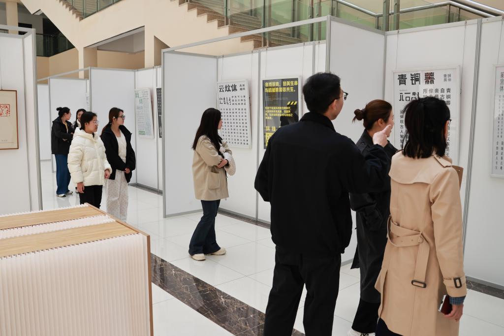 党建铸魂,美育润心。本次展览创意新颖、设计独特、内容丰富,专业化和大众化相结合,科技与人文相交融,入眼、走心。开展当日,现场气氛热烈,师生或驻足观望、或讨论交流,一个个字符穿越历史在观展者的眼里流淌跳跃,在艺术的熏陶中感受中华文化的魅力,在红色文化的洗礼中汲取奋进的力量。