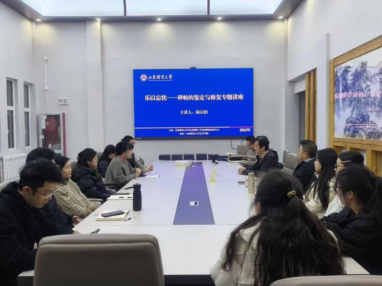 11月12日下午,由学校教师工作部(教师发展中心)主办、艺术学院承办的师资定制培训(第二期)在燕山校区顺利举行。本次培训以“碑帖的鉴定与修复”为核心主题,不仅是提升教师专业素养的重要举措,更是践行美育理念、传承中华优秀传统文化的生动实践。中国国家画院特聘研究员、中国艺术研究院硕士生导师、南京师范大学艺术品保护与修复研究所所长陆宗润应邀主讲,作题为《乐以忘忧——碑帖的鉴定与修复专题讲座》的深度分享。艺术学院首席教授张书学、智慧课程团队成员及校内外对文物艺术品修复感兴趣的师生共同参与,培训由艺术学院副教授崔敬主持。