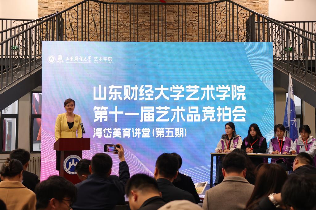 11月16日下午,时值山东财经大学校友会艺术学院分会成立之际,第十一届山东财经大学艺术学院艺术品竞拍会在燕山校区成功举办。本次拍卖会由合作发展处(校友工作办公室)、沃尔德集团、自贸试验区济南片区文化艺术品展示交易中心、金诺国际拍卖集团有限公司等单位指导、支持,商雪梅、高超、王浚泽等50余位校友会艺术学院分会成员、学院师生及社会人士共200余人齐聚现场,共同参与这场融合艺术魅力、实践价值与公益情怀的文化盛会。本次拍卖会由学院国家一流本科课程负责人、国家注册拍卖师周玮佳主持。