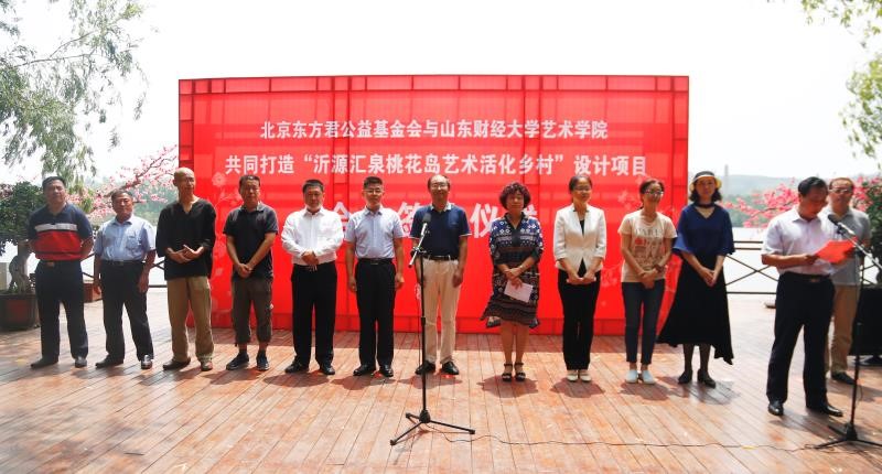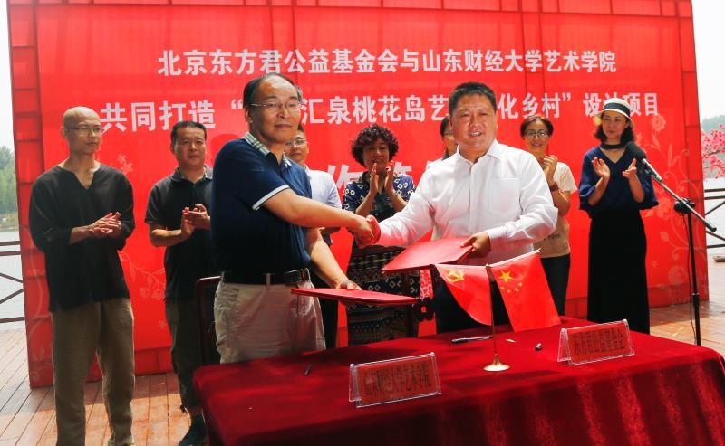 6月26日上午,北京东方君公益基金会与山东财经大学艺术学院共同打造“沂源汇泉桃花岛艺术活化乡村”设计项目合作签约仪式在淄博市沂源县龙子峪桃花岛举行。山东省政协常委、东方君公益基金会会长董方军、沂源县副县长张莹莹、学校校友会办公室主任耿金波、艺术学院院长范正红教授、学院党委书记杨春丽出席签约仪式。范正红和董方军代表双方签署了合作协议。艺术学院师生代表参加了此次活动。.