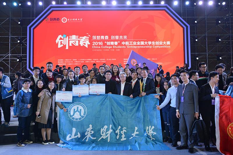 11月19日,由共青团中央、教育部、人力资源和社会保障部、中国科协、全国学联、四川省人民政府主办的2016年“创青春”中航工业全国大学生创业大赛终审决赛在电子科技大学落幕。我校三个学生团队《山东一唯艺术投资有限公司——大学生艺术推介平台》、《山东丰登生物科技有限公司》、《天津金刚文化传播有限公司》勇夺全国金奖,金奖总数位居全国前列、山东省首位。我校以团体总分第19名的优异成绩捧得本次“创青春”全国优胜杯,首次进入“创青春”全国高校第一方阵,实现了历史性新突破。我校还获得三项铜奖,并获得“高校优秀组织奖”。
