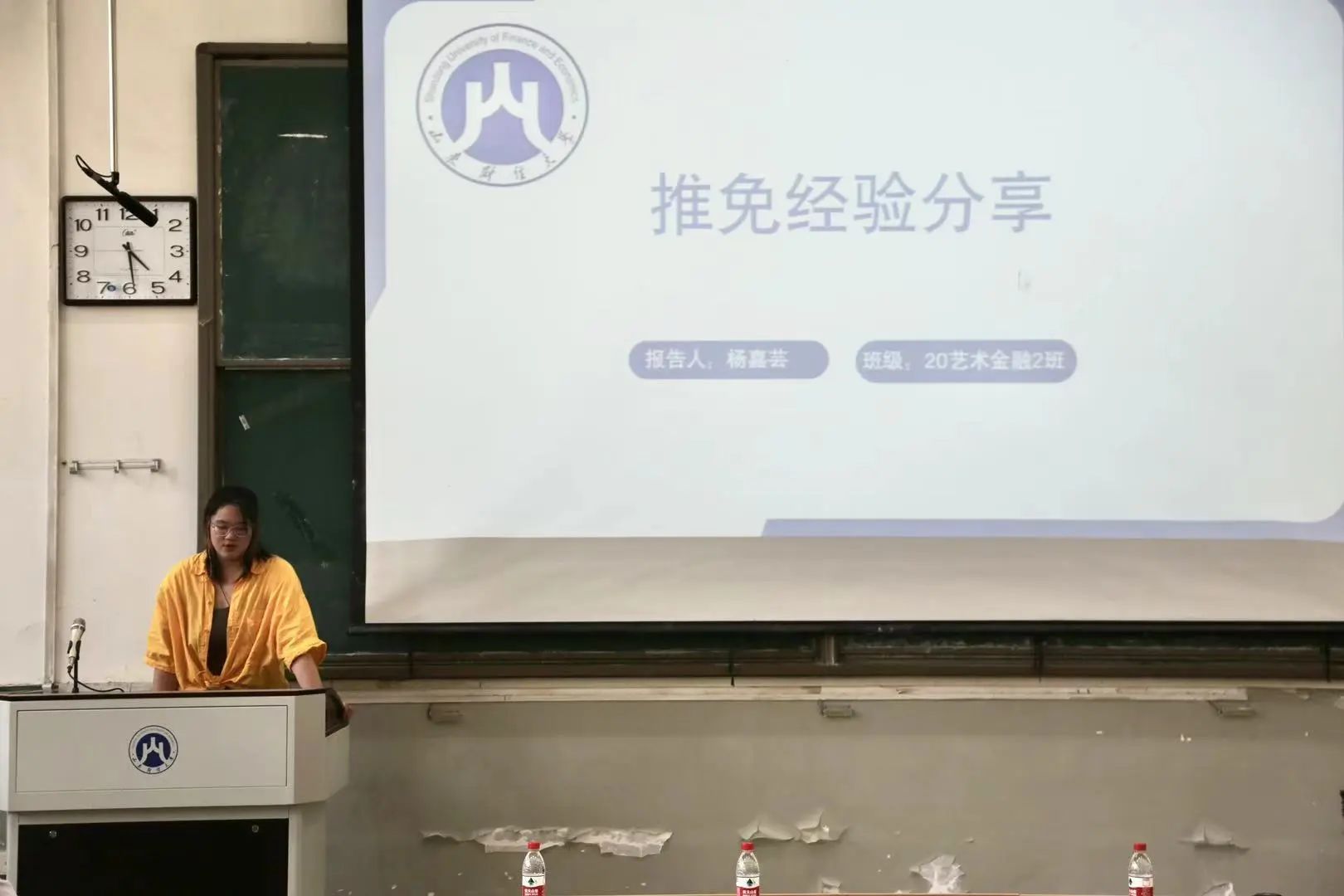 随后,杨嘉芸学姐上台为大家带来了推免方面的经验分享。她详细介绍了推免的基本流程和申请条件,并结合个人经历,详细讲解了推免申请过程中的注意事项和技巧。她强调推免不仅要求同学们具备扎实的专业基础,还需要注重综合素质的培养和提升。她建议同学们多参加各类学术竞赛、实践活动和志愿服务等,以丰富自己的履历和经历。同时,她还分享了如何在申请材料中展示自己的优势和亮点等实用建议。