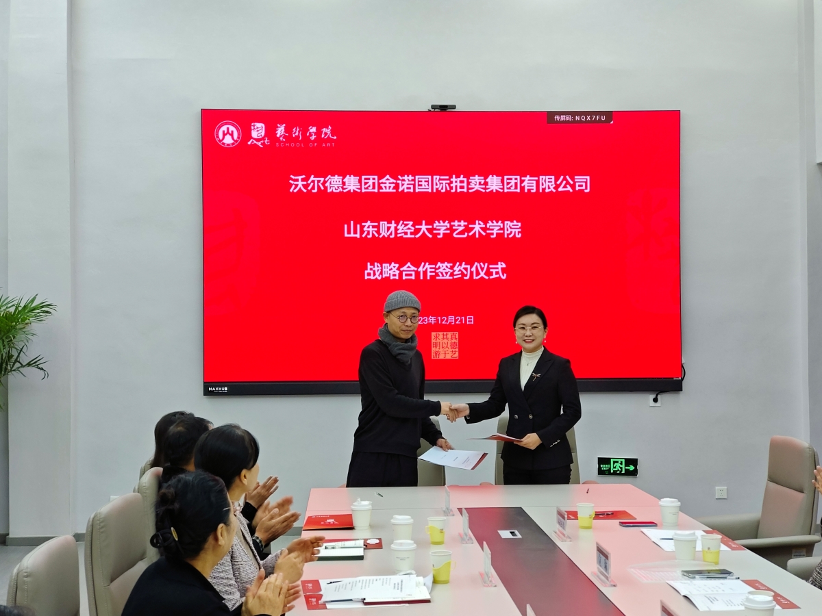 在大家的共同见证下,艺术学院副院长(主持工作)宋述林与金诺国际拍卖集团有限公司总裁位琳共同签订战略合作协议。