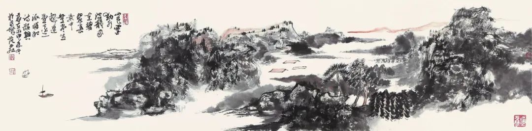 作品:《山色灵动水波静》34.5cm×138cm 纸本国画